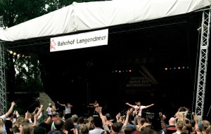 Als ich den Eingang erreiche, muss ich mich zwischen der Schlange für die Wertmarken und den Grüppchen am Bierstand hindurchlavieren, um einen Blick auf die Bühne zu erhaschen. Die Ränge der Amphitheater ähnlich aufgebauten Freilichtbühne sind mäßig gefüllt, aber vor der Bühne, direkt hautnah vor der Band haben sich bereits mehrere Menschen eingefunden und schwingen unbeschwert die Hüften zum Takt der Banda Senderos.