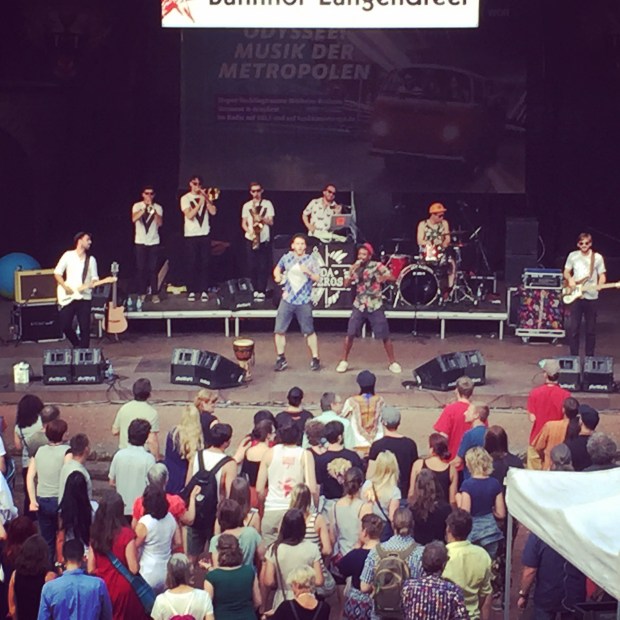 Ich erreiche die Menge vor der Bühne und kann endlich die Jungs der Band auch deutlich erkennen. In jeder Bewegung, jeder Note, jedem Takt spürt man die Leidenschaft, die von Lied zu Lied das Publikum immer mehr ansteckt, sodass sich nach und nach immer mehr Menschen vor der Bühne versammeln und tanzen, was das Zeug hält. Drei Frauen mittleren Alters, die scheinbar alle allein gekommen sind, in weiten Hosen mit Stickerei lassen sich zur Musik gehen, eine Frau mit raspelkurzen grauen Haaren, modischer Brille und Jeanskleid wird von ihrem Tanzpartner schwungvoll auf die inoffiziell als solche deklarierte Tanzfläche gezogen und für einen Mann mit Schiebermütze scheinen wir alle gar nicht mehr zu existieren, es gibt nur ihn und die Musik. Vor mir eine Gruppe von jungen Frauen, Mitte zwanzig, von der die Hälfte kurzerhand beschlossen hat, barfuß tanze es sich besser und zwar bis die Sohlen schwarz sind, schräg hinter ihnen eine Gruppe von jungen Männern mit Bandanas und in Rockerkluft, die sich synchron genüsslich einen ordentlich Hieb Bier gönnen und vergnügt in die Menge schauen.